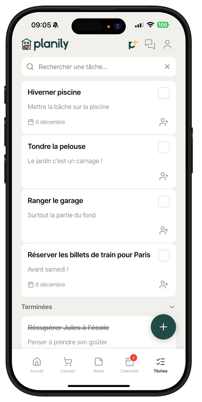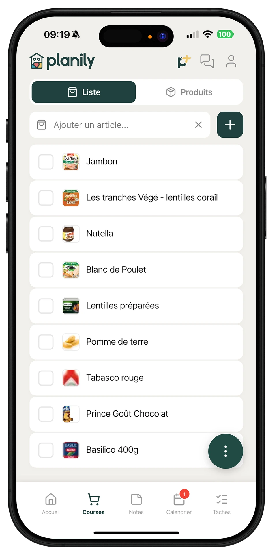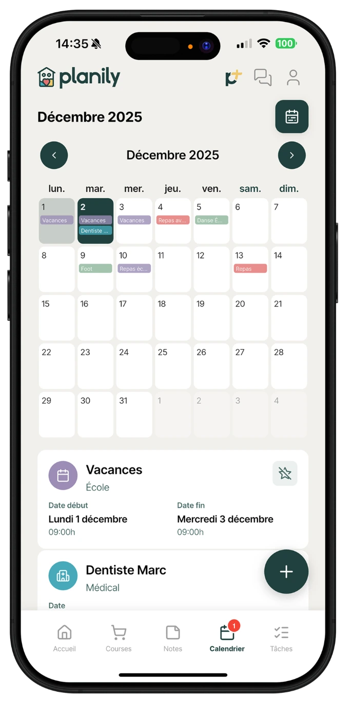 Planning familial, repas de la semaine, liste de courses, suivi des tâches et rappels : tout est centralisé au même endroit pour éviter les post-it, les messages éparpillés et les oublis.